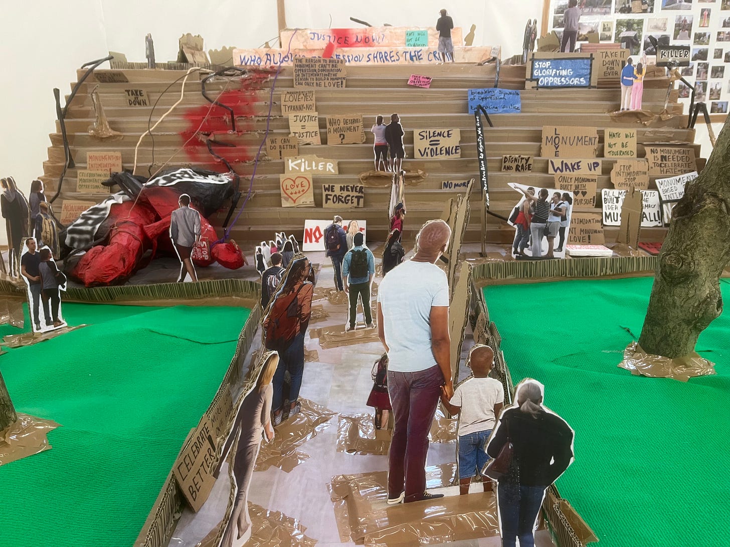 What he finds here and what he distils is rage. An RMF academic and activist Leigh-Ann Naidoo is quoted by Mirzoeff as saying: “The conduit of rage is awareness of another possible world in which that violence does not exist”. From anger to Utopia then, ours is a journey from captivity to freedom with parallels to that of Gulliver. Hirschhorn's gallery of 2D spectators surround these scenes of desecration, and look on in static contemplation. They are a generic bunch, these some hundred onlookers, dressed for tourism or for hiking, not one keffiyeh or balaclava between them. The pint sized onlookers stand with us, to face the dawn of a new post statue world.